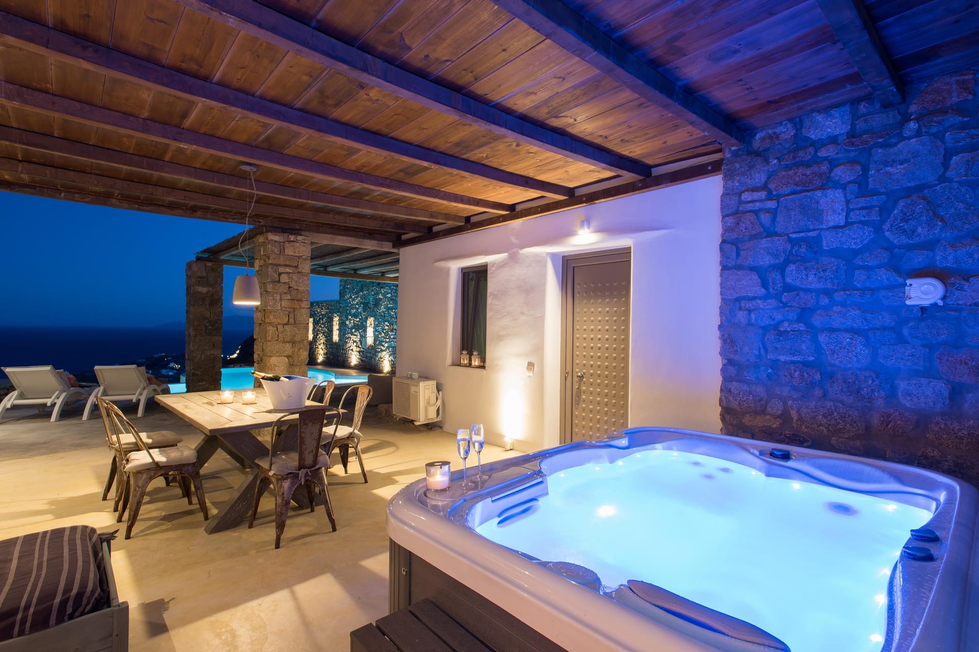 Enjoy panoramic views of the Aegean Sea from your exclusive private infinity pool and outdoor Jacuzzi, hot tub spa, set within a spacious multi-level terrace. A dedicated 45m² patio gracefully extends the outdoor living experience, featuring a shaded dining area with a hand-crafted wooden table. Beyond the patio, the main pool terrace is furnished with elegant hand-crafted sofas, poufs, and oversized sun loungers with plush cushions – perfect for sunbathing or relaxing under the stars. Every moment is unforgettable.