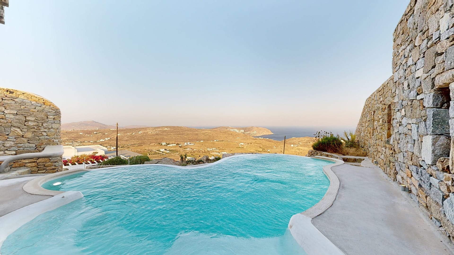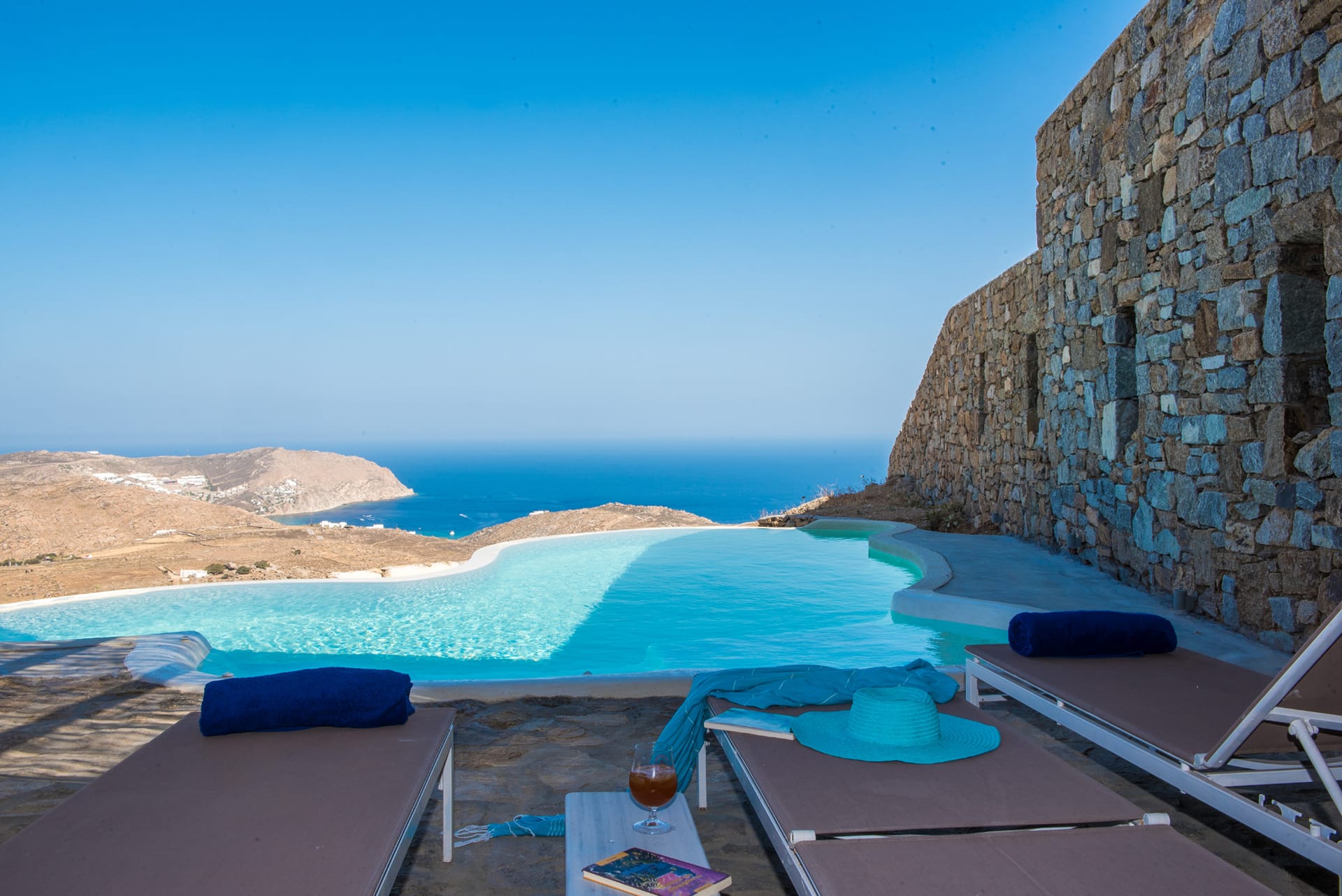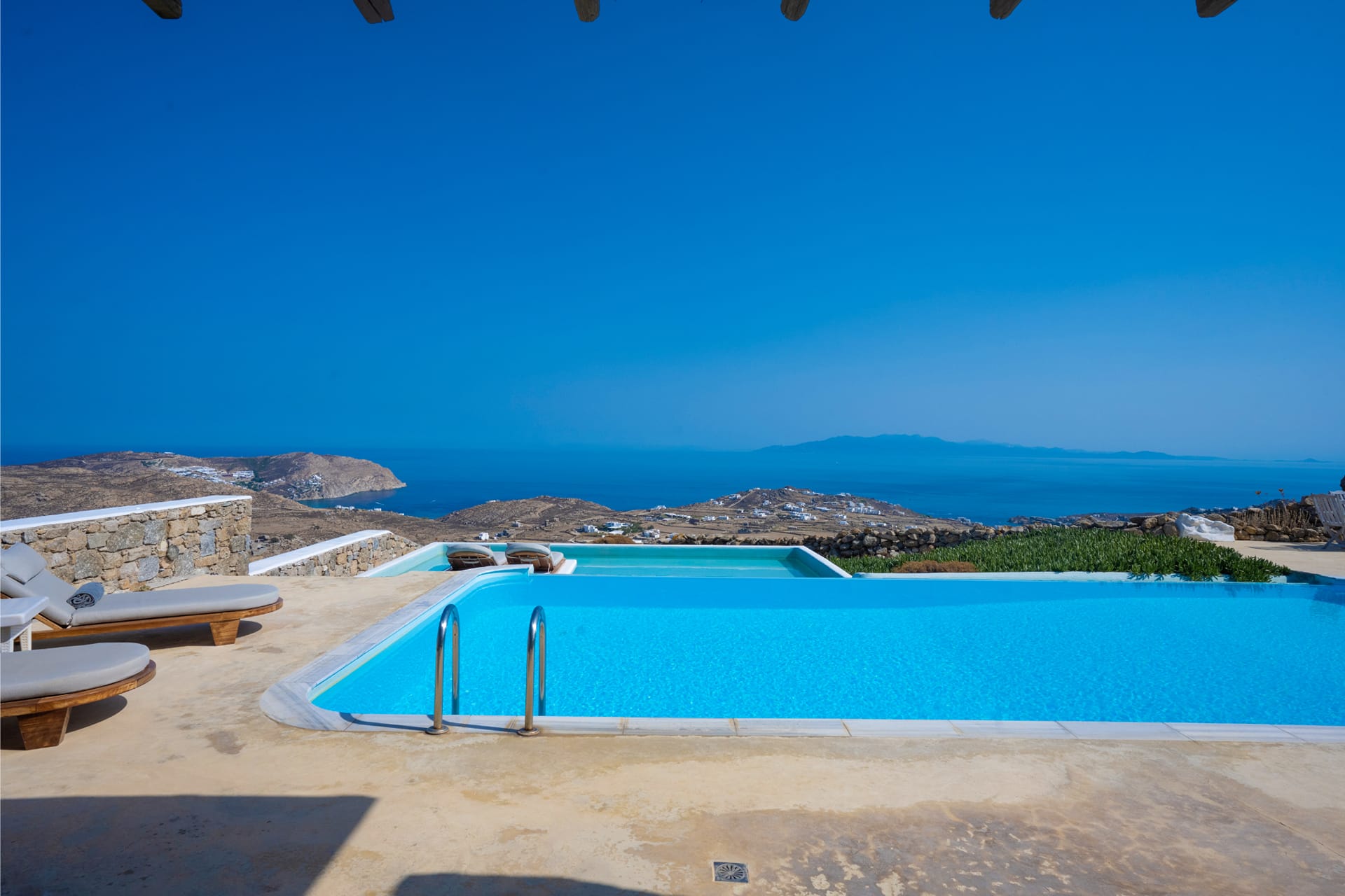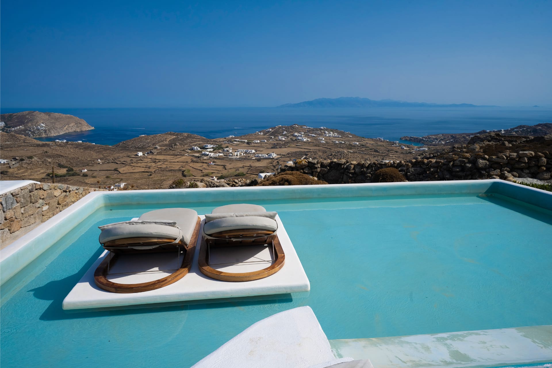 Villa Amallini boasts a stunning private infinity pool, surrounded by wooden sun loungers with plush cushions, ideal for soaking in the Mykonian sun.