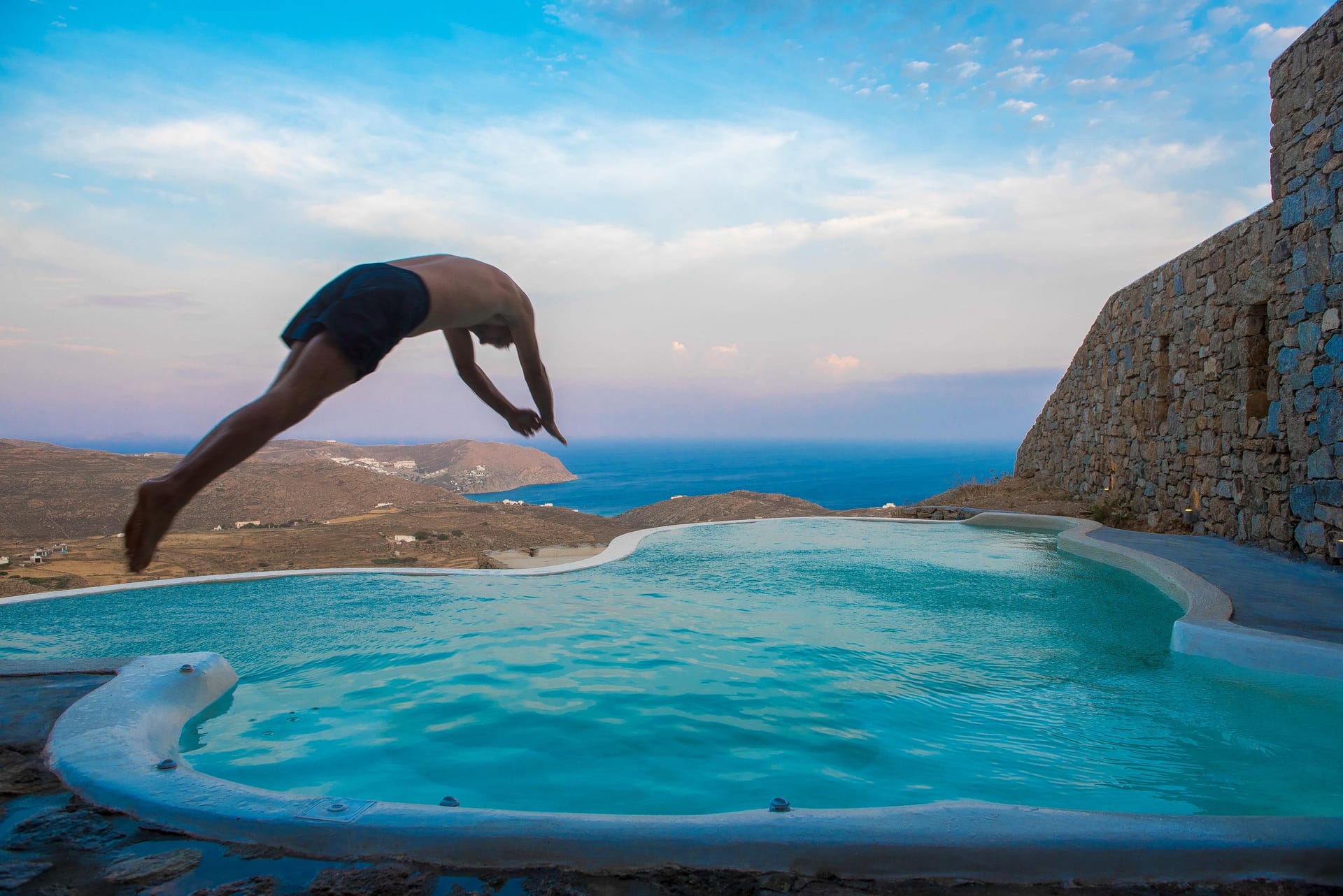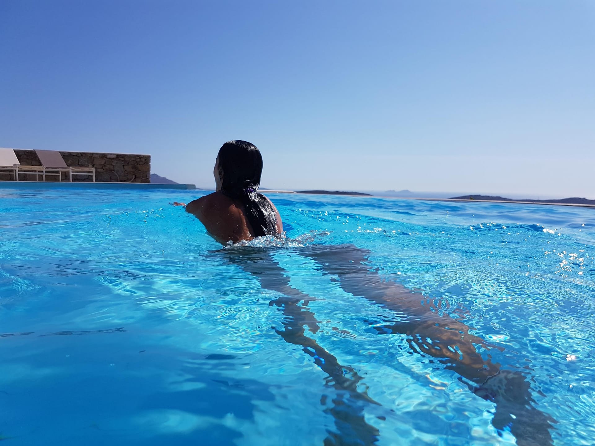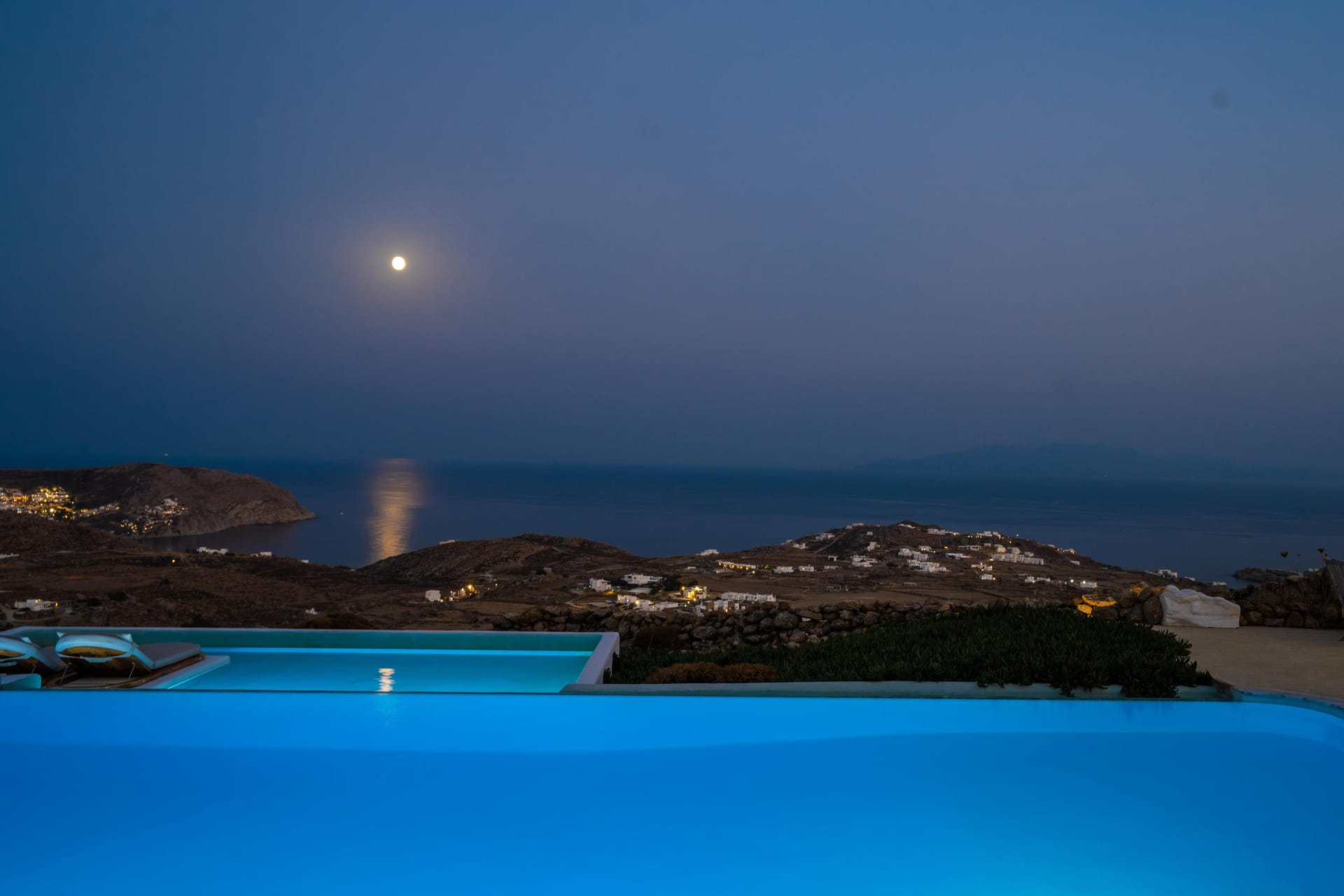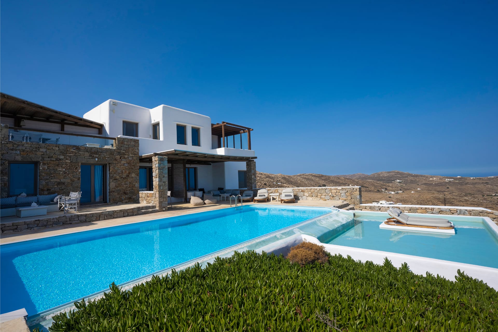 Villa Amallini boasts a stunning private infinity pool, surrounded by wooden sun loungers with plush cushions, ideal for soaking in the Mykonian sun.