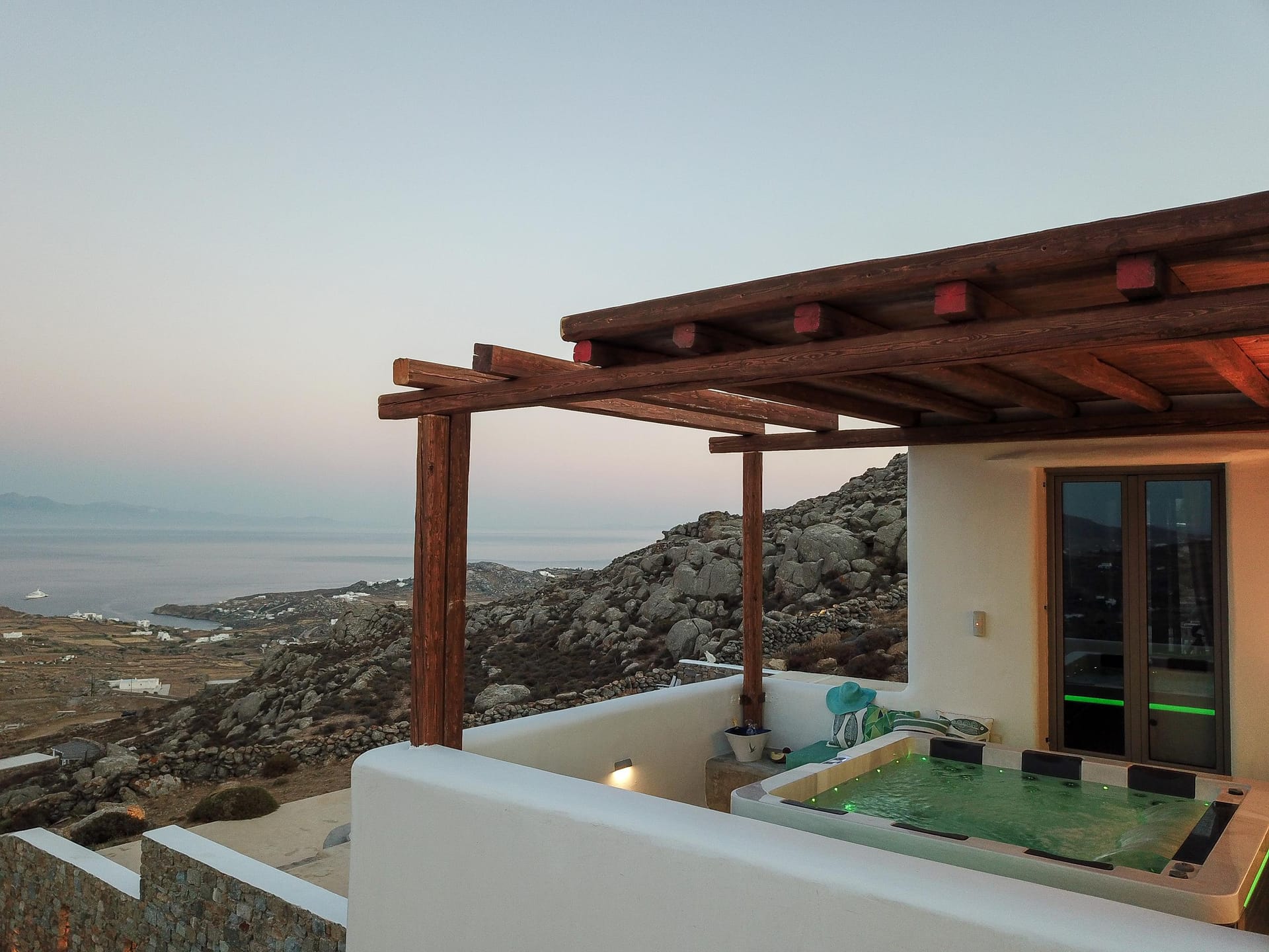 Max: Room facilities:24hour Security, 3 Menus Available for Ordering Breakfast, Lounge and Dinner, Advanced Security Alarm System, Bathroom with Jacuzzi, Bathroom with Shower, Bluetooth HiFi Sound System, Cable-Satellite TV, CAR and ATV rental services, Central Heating, Closet, Cozy Lounge Areas on Terraces, Daily Maid Service (additional cost), Dining Table, En-Suite Bathroom, Espresso Machine & Coffee Products, External Private Jacuzzi in Patio, Full-length Mirror, Fully equipped kitchenette, Guest Laundry (additional cost), Hairdryer, High speed internet by StarLink of SpaceX, House Wine and Fruit Basket upon arrival, Individually Controlled Air Condition, Iron & ironing board, Living Room, Music, Non-smoking rooms available, Patio Dining Room, Pool View, Private Balcony or Terrace, Private Hot tub Spa, Private Infinity Swimming Pool with Hydromassage, Private Property with Free Parking, Queen Size Bed and sofa bed with Anatomic Mattress for Optimal Comfort, Razor Plug, Refrigerator, Room Service (up to midnight), Safe and Secure Environment, Satellite Samsung Smart 55" TV with Free Netflix, Seaview Unobstructed 180°, Sitting Area, Sofa Bed, Soundproof Windows, Stereo system with Mp3, Terrace with Spectacular Sea Views, Traditional Handmade Furnishing, Veranda, Well-lit Outdoor Areas for Safety, Wi-Fi Internet Access (free of charge), Writing Desk, Μπουκάλι κρασί, Bath Amenities, Beach Towels, Pool towels, safe deposit box