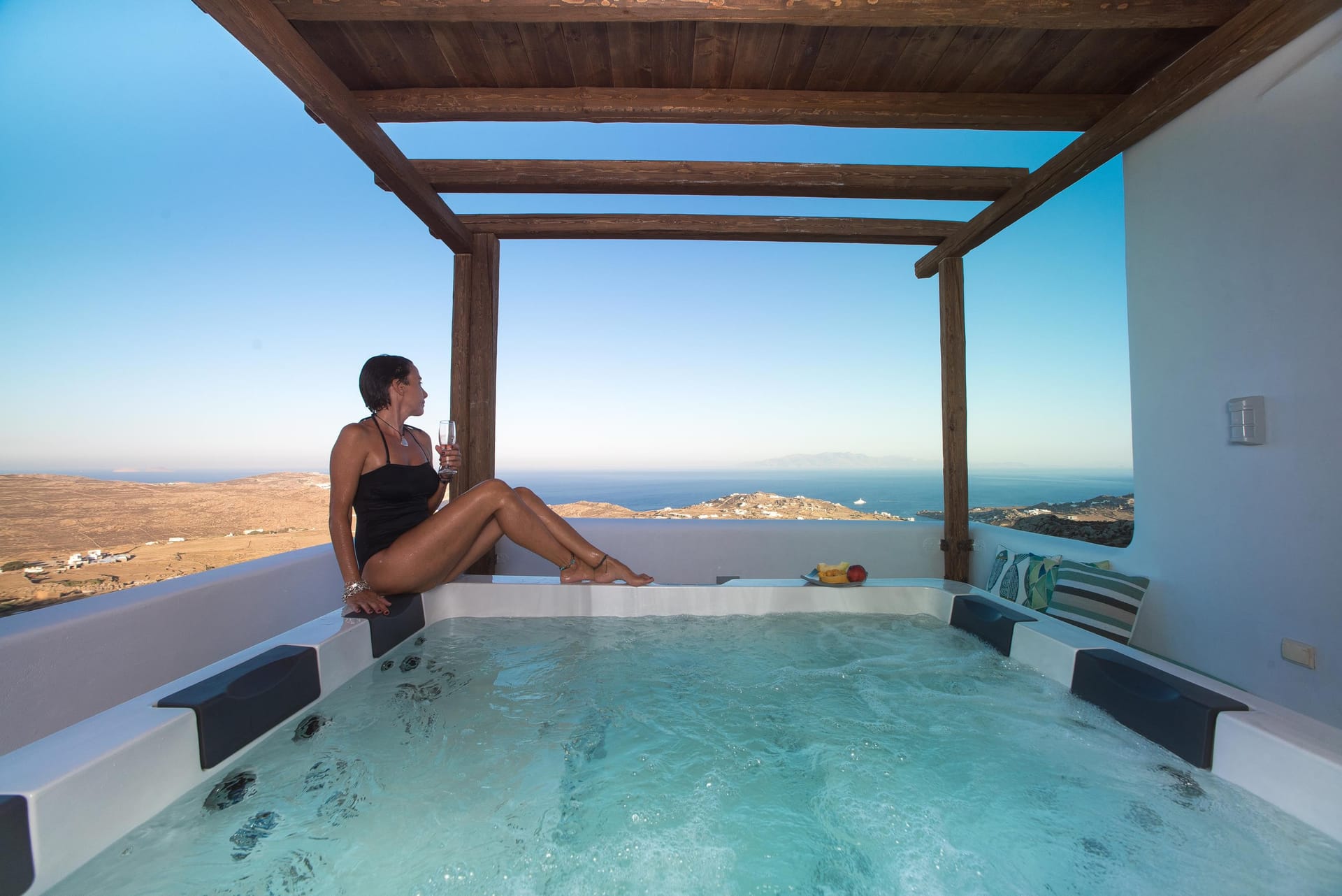 Max: Room facilities:24hour Security, 3 Menus Available for Ordering Breakfast, Lounge and Dinner, Advanced Security Alarm System, Bathroom with Jacuzzi, Bathroom with Shower, Bluetooth HiFi Sound System, Cable-Satellite TV, CAR and ATV rental services, Closet, Cozy Lounge Areas on Terraces, Daily Maid Service (additional cost), Dining Table, En-Suite Bathroom, Espresso Machine & Coffee Products, External Private Jacuzzi in Patio, Full-length Mirror, Fully equipped kitchenette, Guest Laundry (additional cost), Hairdryer, High speed internet by StarLink of SpaceX, House Wine and Fruit Basket upon arrival, Individually Controlled Air Conditions, Iron & ironing board, Living Room, Music, Non-smoking rooms available, Patio Dining Room, Pool View, Private Balcony or Terrace, Private Outdoor Mini Pool/Hot tub Spa, Private Property with Free Parking, Queen Size Bed and sofa bed with Anatomic Mattress for Optimal Comfort, Razor Plug, Refrigerator, Room Service (up to midnight), Safe and Secure Environment, Satellite LG Smart 55" TV with Free Netflix, Seaview Unobstructed 180°, Sitting Area, Sofa Bed, Soundproof Windows, Stereo system with Mp3, Terrace with Spectacular Sea Views, Traditional Handmade Furnishing, Veranda, Well-lit Outdoor Areas for Safety, Wi-Fi Internet Access (free of charge), Writing Desk, Μπουκάλι κρασί, Bath Amenities, Beach Towels, Pool towels, safe deposit box