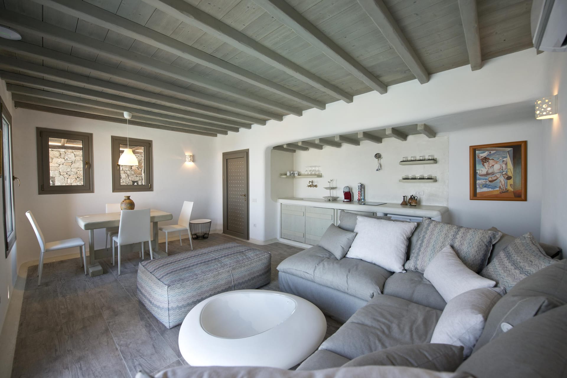 Outdoors, guests enjoy a 30 m² shaded stone patio with glass-panel enclosure, housing a spectacular handmade solid chestnut dining table, a coffee corner, and additional fridge/freezer — ideal for long Mykonian dinners or peaceful evenings with sea views.