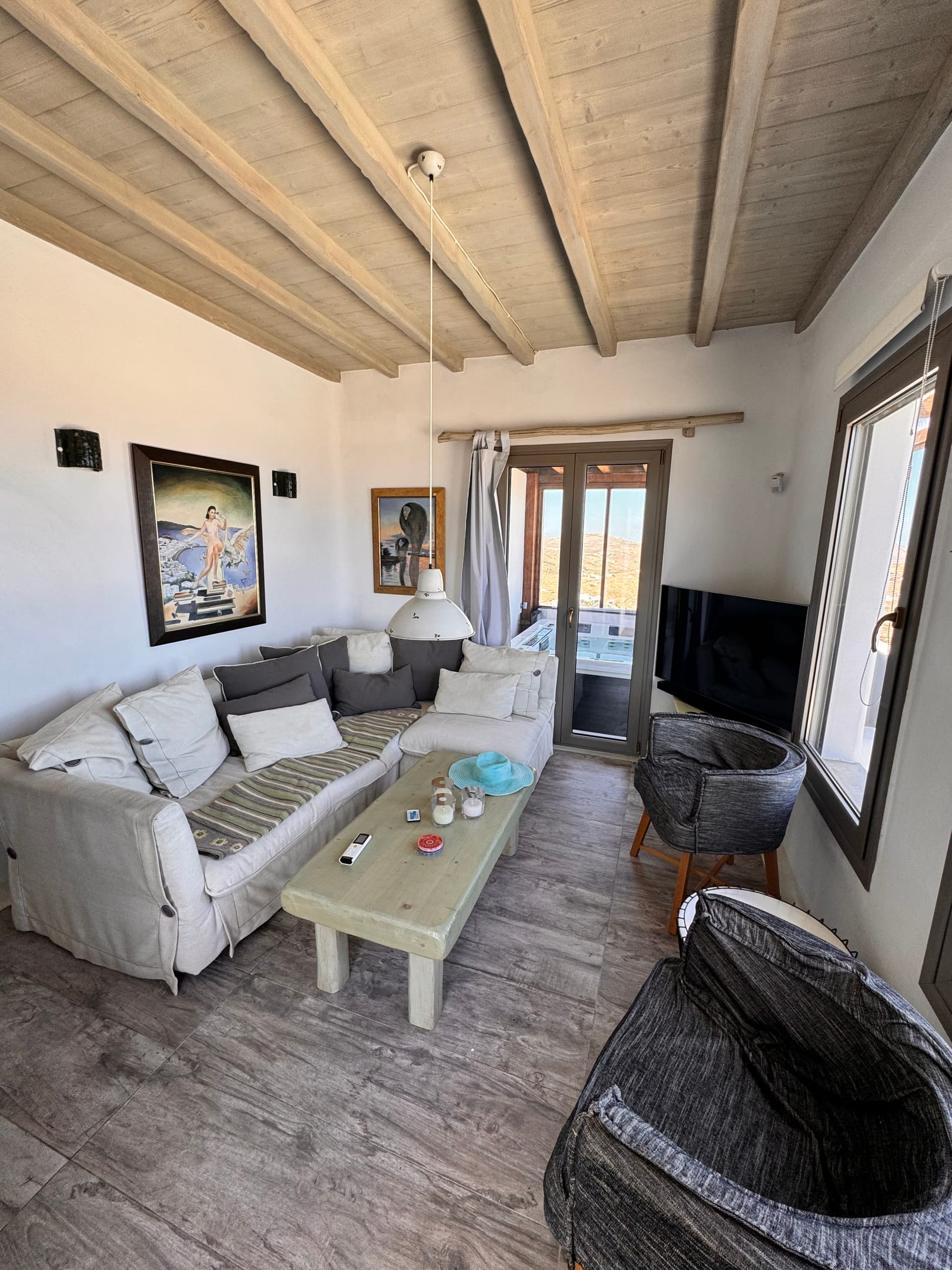 Aris Sky Suite is a luminous 69 m² retreat located just above the iconic Super Paradise Beach in Mykonos. Thoughtfully designed for couples, families, or friends, it features two comfortable bedrooms with queen-size beds (one of which also includes a single bed), two ensuite bathrooms, and a living area with a handcrafted plush sofa that can accommodate an extra guest.