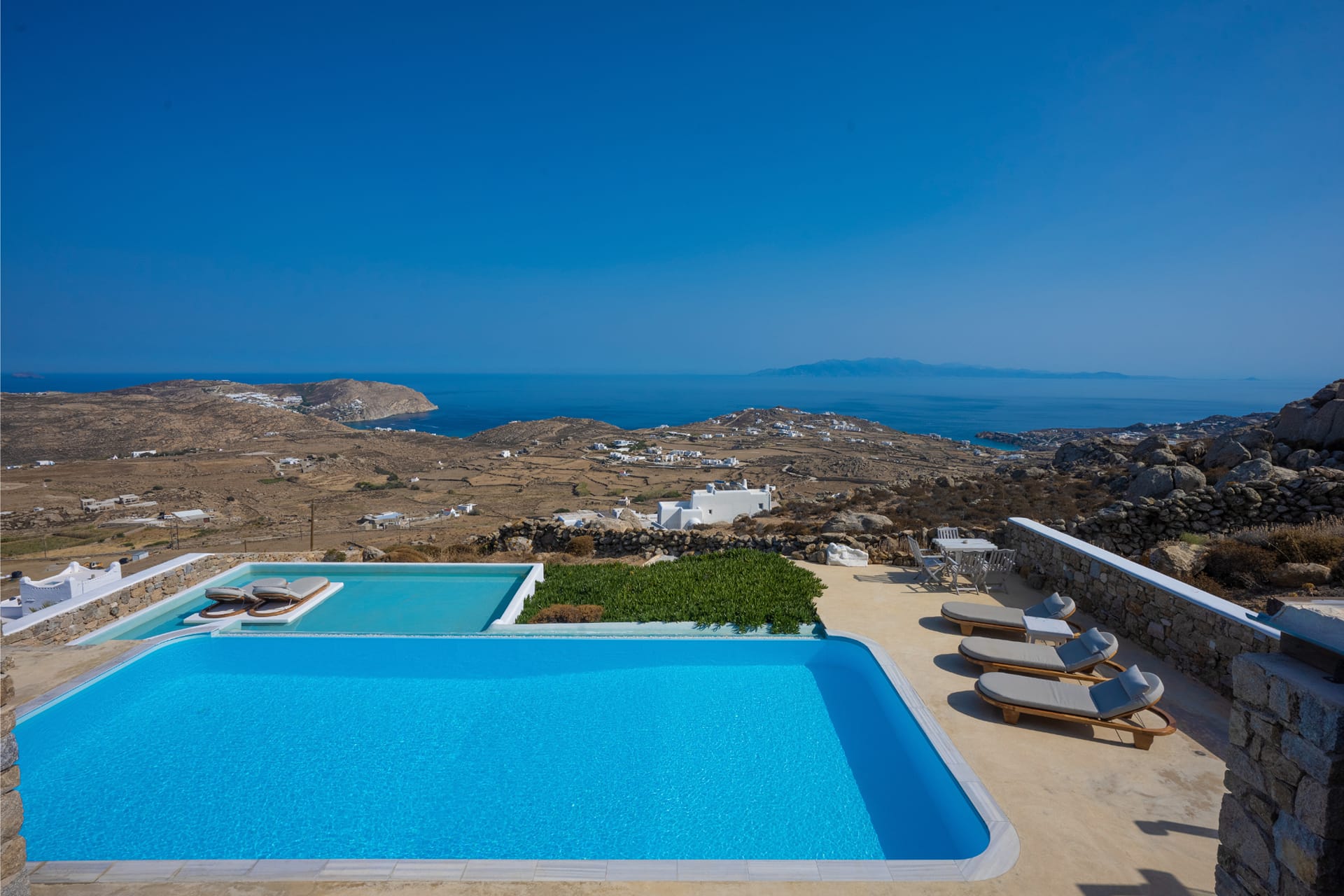 Max: Room facilities:24hour Security, 3 Kitchens, 3 Living Rooms, 3 Menus Available for Ordering Breakfast, Lounge and Dinner, Advanced Security Alarm System, Bathroom with Jacuzzi, Bathrooms with Shower, Bluetooth HiFi Sound Systems, Cable-Satellite TVs, CAR and ATV rental services, Closet, Cozy Lounge Areas on Terraces, Daily Maid Service (additional cost), Dining Table, En-Suite Bathroom, Espresso Machines & Coffee Products, External Private Jacuzzi in Patio, Full-length Mirror, Fully equipped kitchenette, Guest Laundry (additional cost), Hairdryers, High speed internet by StarLink of SpaceX, House Wine and Fruit Basket upon arrival, Individually Controlled Air Conditions, Iron & ironing board, Large Private Infinity Swimming Pool, Music, Non-smoking rooms available, Patio Dining Room, Pool View, Private Balcony or Terrace, Private Outdoor Mini Pool/Hot tub Spa, Private Property with Free Parking, Queen Size Bed and sofa bed with Anatomic Mattress for Optimal Comfort, Razor Plug, Refrigerators & Freezer, Room Service (up to midnight), Safe and Secure Environment, Satellite Samsung Smart 55" TV with Free Netflix, Seaview Unobstructed 180°, Sitting Areas, Sofa Bed, Soundproof Windows, Stereo systems with MP3, Terrace with Spectacular Sea Views, Traditional Handmade Furnishing, Verandas, Well-lit Outdoor Areas for Safety, Wi-Fi Internet Access (free of charge), Writing Desk, Μπουκάλι κρασί, Bath Amenities, Beach Towels, Pool towels, safe deposit box