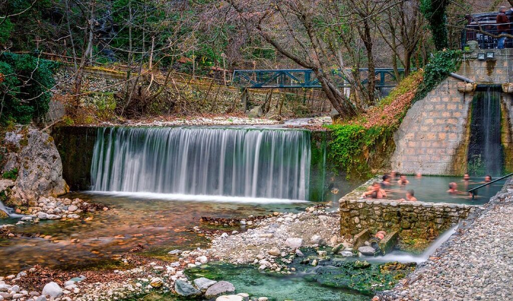 Here, the hot springs merge with the cold waterfalls of the Thermopotamos (or Agios Nikolaos stream), creating a spectacular setting of natural pools and small cascades. You can immerse yourself in the warm, therapeutic waters in outdoor pools next to the river, enjoying the wild beauty of the gorge, or choose one of the indoor, private pools for ultimate relaxation and tranquility. The waters are renowned for their healing properties for circulatory, respiratory, rheumatic, gynecological, and skin conditions, while balneotherapy is recommended for liver, kidney, and digestive system issues.