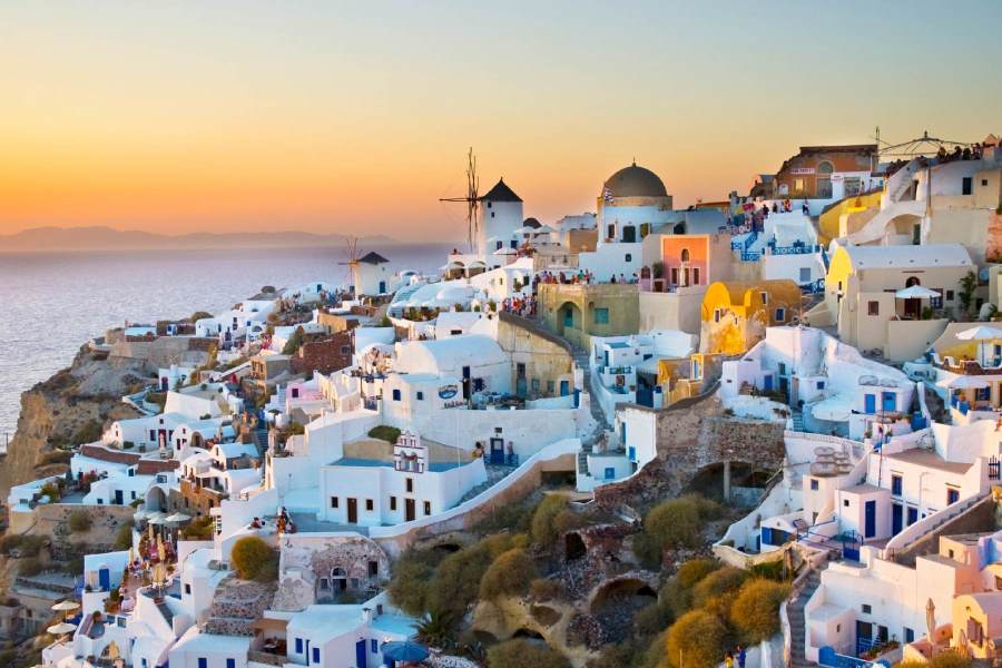 The blue of the sky and sea harmonizes with the sun and the whiteness of the houses.
